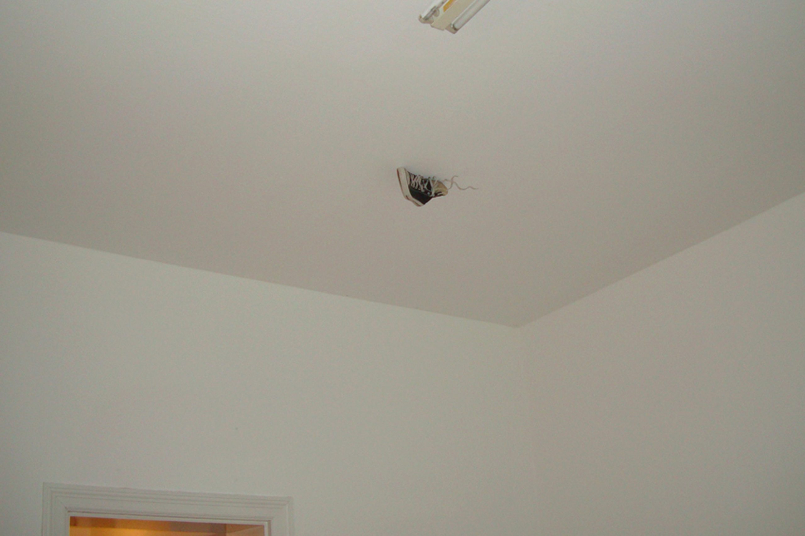 Inside the room, immediately below the ceiling, a shoe hovers.